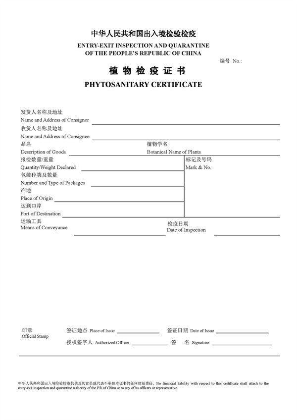植物檢疫證書 PHYTOSANITARY CERTIFICATE